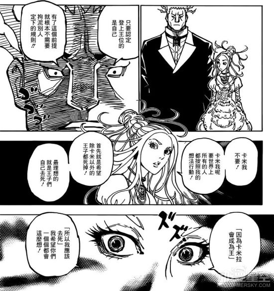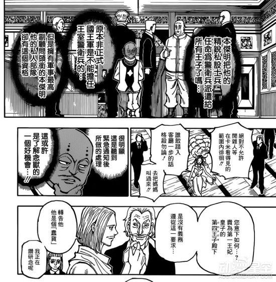 《全职猎人》363话汉化版公开,在这一集中想要夺取王位的王子们开始各自的计划。虽然每个王子都有自己的想法和计划,但是其中最有实力还是大王子本杰明,而且他一离开会场就打算要杀死所有的王子,也是相当的可怕。而二王子卡米拉则展示她的超级公主病,她认为所有的王子在知道图想要成为王的时候,都应该选择自己去死。