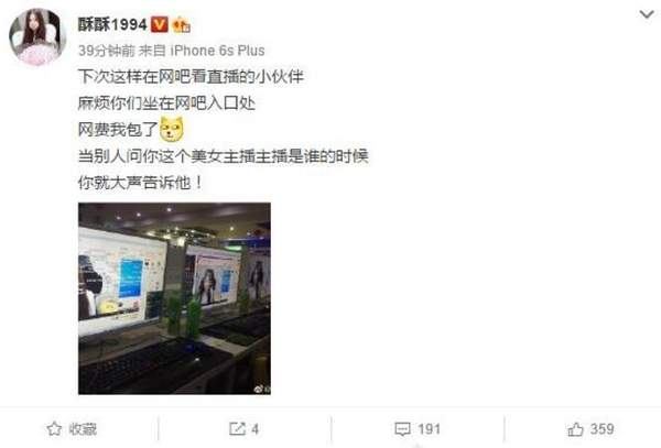 近日,LOL美女主播酥酥发微博晒出了一张照片,原来是一位粉丝包下网吧许多的电脑一起开着酥酥的直播间!照片上的酥酥此时似乎正陶醉在自己的歌声中。