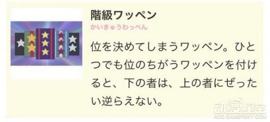 效果:为一整套的徽章,其中分别代表军队中的各阶层,将代表某个阶层的徽章贴在人的身上,下层的人就要听上层的人的命令,并且该徽章只有“大将”阶层才撕得下来。