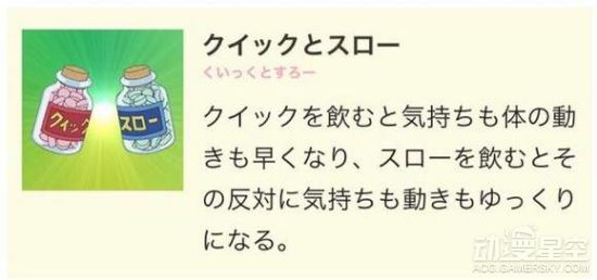 效果:为两种药丸,吃下快的药之后动作性情就会变得很急,而且会慢不下来;反之吃了慢的药之后性情态度动作就变得很慢。吃药数量越多,效力愈强,有效期约数个小时,两种药可以互相抵消。