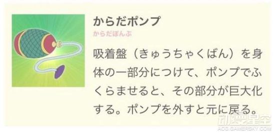 效果:外形为一般的打气筒,把打气的一端接在身体上,就可以使身体的该部位变大,拿掉后会马上泄气。在短篇故事中,大雄曾使用该道具假装巨人来吓唬胖虎。
