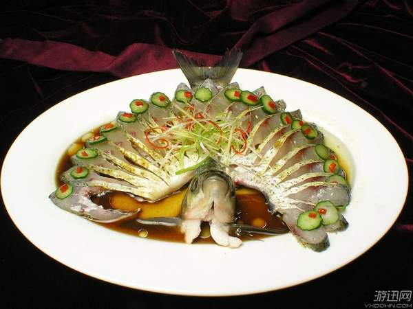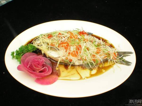 “武昌鱼”产于湖北省鄂州市(古时称武昌),俗称团头鲂。据《武昌县志》载:鲂,即鳊鱼,又称缩项鳊,产樊口者甲天下。是处水势回旋,深潭无底,渔人置罾捕得之,止此一罾味肥美,余亦较胜别地。”同时,以“鳞白而腹内无黑膜者真。” “清蒸武昌鱼”是选用鲜活的樊口团头鲂为主料,配以冬菇、冬笋、并用鸡清汤调味。成菜鱼形完整、色白明亮、晶莹似玉;鱼身缀以红、白、黑配料,更显出素雅绚丽。特点:肉质鲜嫩,营养丰富。