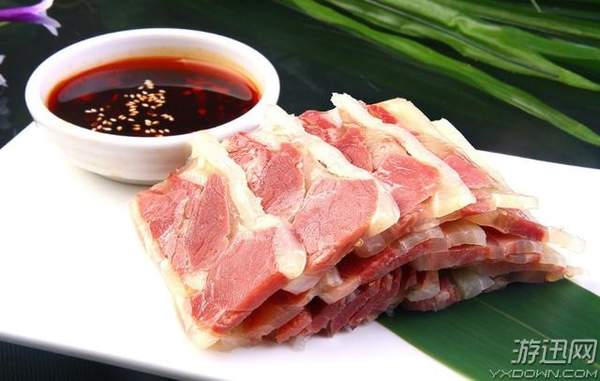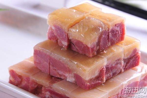 水晶肴蹄,又名水晶肴肉,是江苏镇江的一款名菜,迄今已有300多年的历史。水晶肴蹄成菜后肉红皮白,光滑晶莹,卤冻透明,犹如水晶,故有“水晶”之美称。食用时,具有瘦肉香酥、肥肉不腻、酥香嫩鲜等特点,佐以姜丝和镇江香醋,更是别有一番风味。有诗赞曰:“风光无限数今朝,更爱京口肉食烧,不腻微酥香味溢,嫣红嫩冻水晶肴。”
