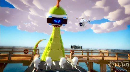 如果非VR玩家跑到了道路尽头,就轮到他们进行反击了。在这个环节非VR玩家将捡起路上散落的各种物品砸向怪兽的脑袋。VR玩家必须躲避这些攻击,如果受到太多攻击,非VR玩家就会用大爆炸把怪兽送回太空。游戏运用PSVR独特的交流萤幕功能,可以和没有佩戴VR设备的小伙伴一起愉快的玩耍,解决了平时无法和朋友一起玩VR的情况。