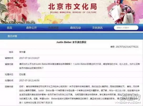 7月16日,有网友在北京市文化局网站上提问,“请问为什么不允许Justin Bieber来华演出请给出详细解释!!Justin Bieber获得过多次大奖,肯定有他的才华、过人之处,为什么没有给予内地粉丝欣赏的权利?