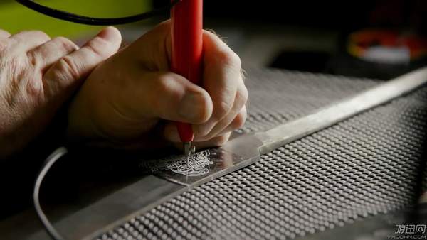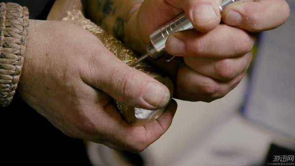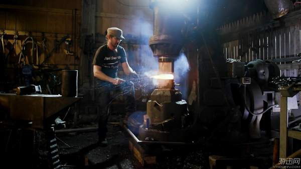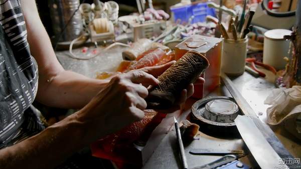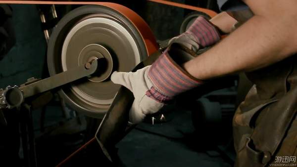 为了保持剑身的韧性和硬度,这次他们依旧采用了“夹心”钢材来打造剑刃,不愧是专业铁匠,片子开头总少不了火花四溅的打铁场景,这帮工匠也不都是大老粗,他们对于剑柄上繁复的花纹也是一丝不苟,用树脂为基料,精雕细刻制作模具,然后浇筑出精美的金属剑柄装饰,剑身在经过淬油、打磨之后也已经寒光乍现,然后二者组合起来就大功告成了,其实在设计之初,铁匠们对这把剑缺乏一些细节资料,不过多亏了其中一位是《地狱男爵》的忠实粉丝,在他的帮助下完美的还原了电影中王子剑的形象。