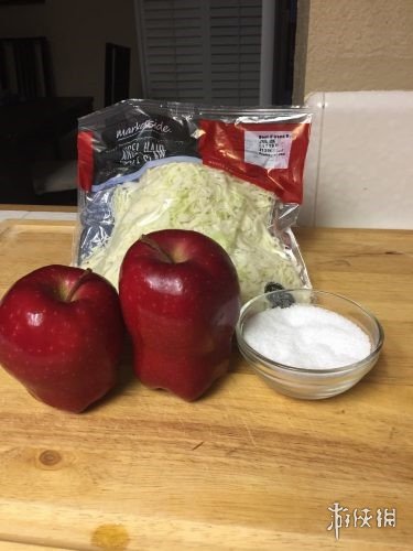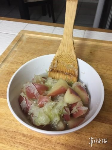 制作过程:在老滚5里煮过饭的人应该都知道这道菜肴,它能够+10血量和+15耐力,之所以选一堆盐是因为游戏里就是这么写的(你在逗我!?)。做的方法很简单,只要将苹果和卷心菜切碎就放在一起煮就行了,当然别忘了放“盐堆”。