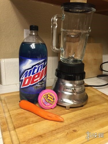 制作过程:虽然健康的思慕雪早餐饮料在《辐射4》中并不存在,但是这种饮料却是受到游戏的启发而制作的,首先需要核子可乐,因为游戏中的这种可乐是蓝色的,所以现实中只能拿同为蓝色的激浪Voltage饮料来代替,然后就是放进能加血的泡泡糖和胡萝卜,不过它们的坏处在于会涨辐射点。三者被放在榨汁机里搅拌,最后被做成了这样。