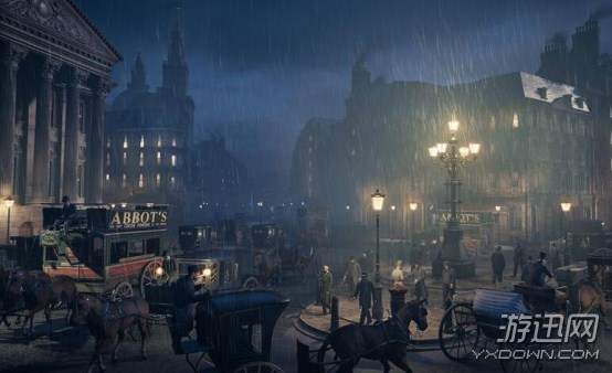 在强化版Anvilnext引擎的渲染下,游戏画面拥有了极高的还原度:大本钟、国会大厦、西敏寺等标志性建筑都宛如实景再现一样逼真;工业区高耸的烟囱,厂房中忙碌的工人以及被压迫的儿童,街道上川流不息的马车,也都饱含了那一抹时代色彩;与此同时,本部作品还首次加入了昼夜循环和动态天气系统,玩家既可以在泰晤士的河边享受“雾霾”的洗礼,也可以在大本钟之上的夜色下俯瞰全城灯火辉煌,整体的游戏体验相当出色。
