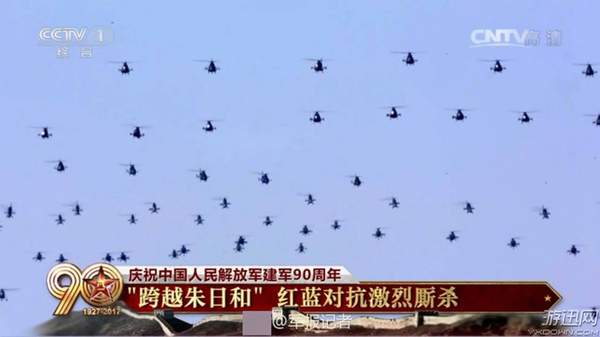 空中标识梯队出场。17架直升机组成“八一”标识,24架直升机汇成“90”字样,象征人民军队走过90年光辉历程。