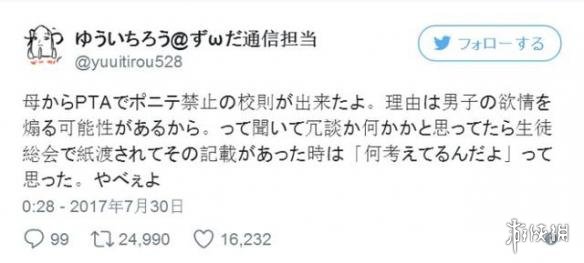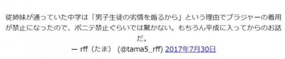 有网友也表示自己堂姐妹就读的初中不让女生穿胸罩,因为会挑拨男生的情欲,因此对于禁止扎马尾已经不再感到惊讶了。事实上,PTA在2016年也下过禁止小学生穿过膝长袜的规定,理由是希望防止痴汉对小学生下手。