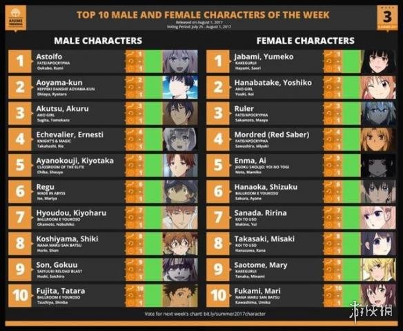 欧美日本动画投票项目Anime Trending近日公开了最新的新番角色人气排行榜,上榜的角色除了来自《Fate/Apocrypha》之外,许多在亚洲地区人气一般的角色因为欧美观众的热情上榜。下面我们就来看看这期的榜单。大家也可以看看有没有令自己感到意外的角色。