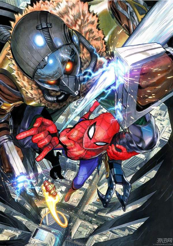 漫威新电影《蜘蛛侠:归来》即将在日本上映,作为蜘蛛侠的忠实粉丝,日本漫画家村田雄介于近日专门推出了《蜘蛛侠:归来》的插画。这张插画再次展示了村田的构图能力和良好的镜头感,图中小蜘蛛和秃鹫在空中纠缠在一起,而钢铁侠正从下方赶来。