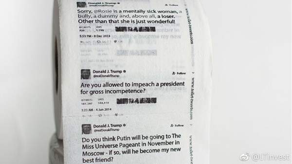 对于葛宇路的行为,我感觉还没有亚马逊艺术。亚马逊跟川普一直对骂,近日亚马逊推出一款厕所手纸,印有川总推特发的贴。