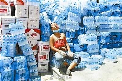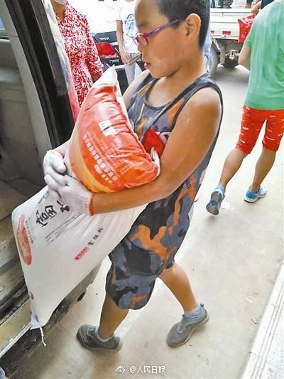 七月的时候陕西绥德发洪水,12岁的胡智博主动提出要去救灾,帮忙搬东西太累了就瘫在矿泉水山旁睡一会儿。