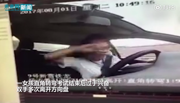 对,这就是女版的东子。考科目二通过直角转弯后太兴奋,在车里嗨了起来。双手多次离开方向盘,虽然后面几项也成功通过,但考试过程中的“放飞自我”行为有非常严重的安全隐患,最后被认定“按照考试不合格处理”。