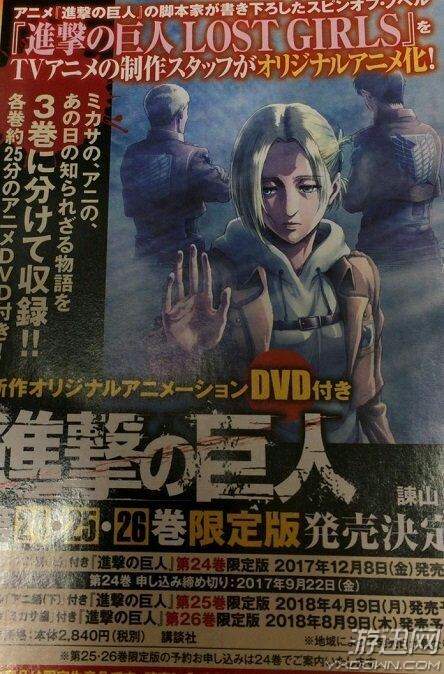 《进击的巨人》作为一个强大的IP,无论是动漫还是电影都深受粉丝们的喜欢。近日,官方宣布《进击的巨人》外传小说《Lost Girs》将要推出OAD动画,动画将跟随漫画单行本第24卷、25卷、26卷推出。这本外传小说讲述的是阿尼与三笠之间不为人知的故事,看来已经消失很久的阿妮终于要再度露面了。