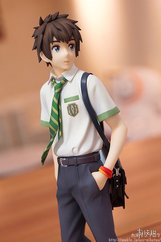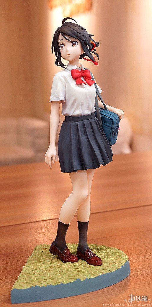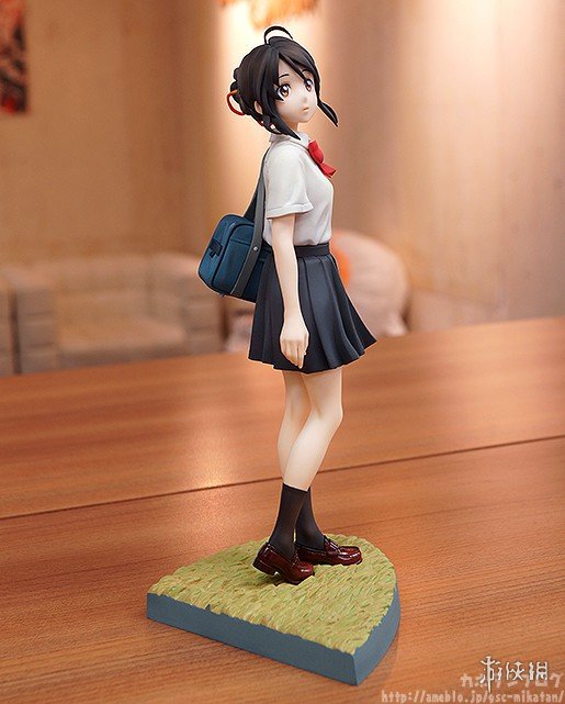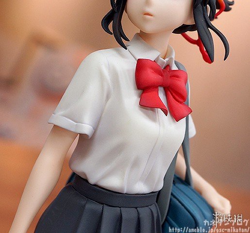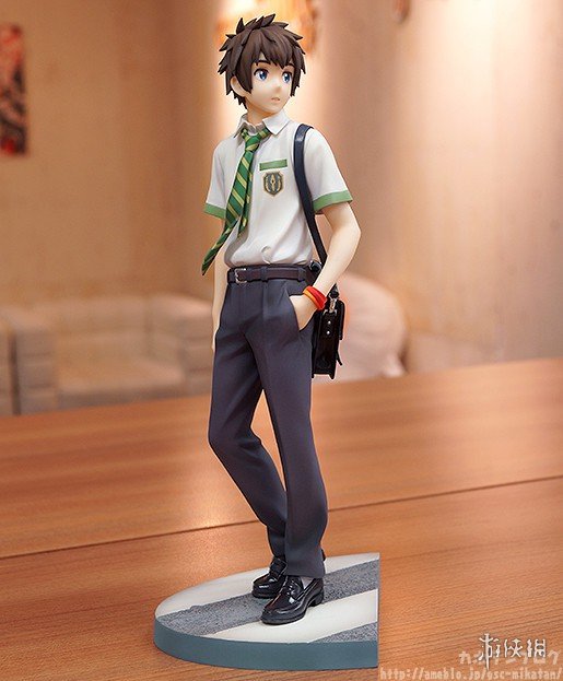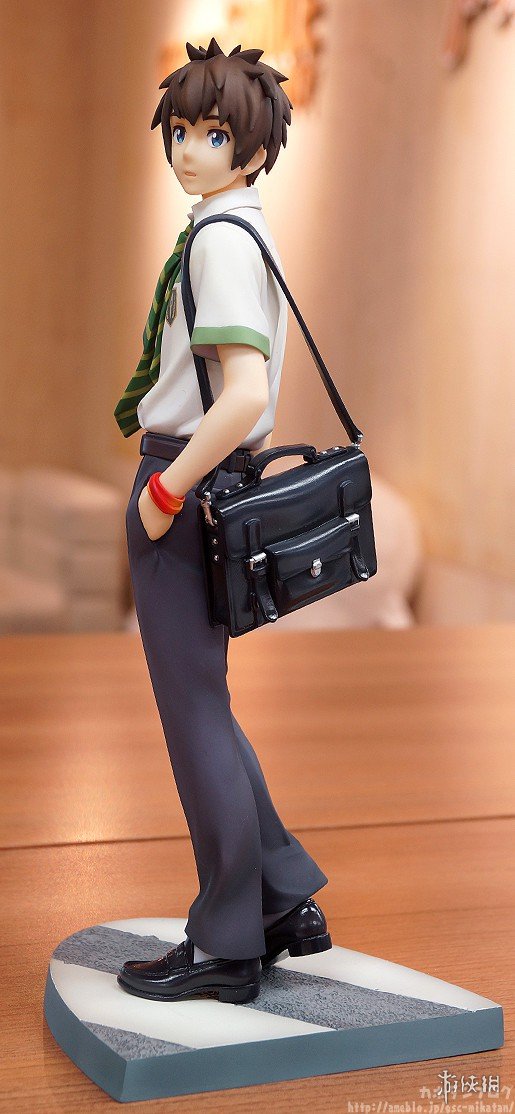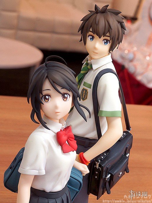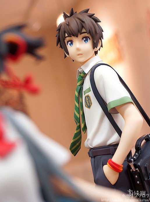 本款手办还原了泷与三叶在《你的名字。》海报上的姿势,两人脚下的台座分别对应了他们的出身地(泷的城市街道、三叶的乡下草坪),可见细节方面的巧妙。而当把两只手办按照不同方式摆列后,还可以呈现出泷与三叶深情对视的场景,爱意满满。此外,三叶的头绳、领结和制服褶裙,泷的领带和挎包都凝聚着制作者的细致用心,极具清新的美感。
