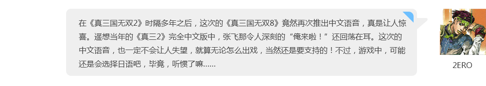 其实《真三国无双》系列早在PS2时代就发售过全中文语音版,但反响却不尽如人意。当然彼时无论是中国游戏市场还是配音质量与现在都不可同日而语,此次光荣的全中文语音计划也昭示了他们对于中国市场的重视。