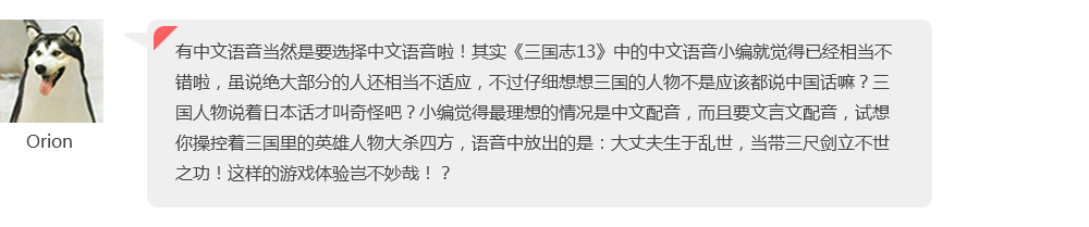 不过在CJ的采访中,《真三国无双8》的制作人铃木亮浩也表示,国行版本因为包含中文语音,所以可能就不会再加入原版日文语音,如果真的要在这二者中选择一个,你会怎么选呢?