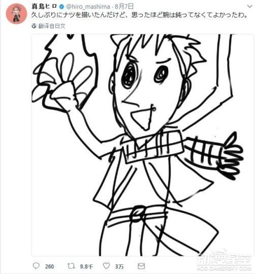 真岛浩展示了如同小学生一样的纳兹涂鸦,并配上文字:虽然时隔这么久再次画了纳兹,不过功力并没有比想象中退步那么多真是太好了。网友们纷纷对此表示怀疑:“这是真的吗?你别骗我。”“我不相信。”“与其说是手腕劣化了,不如说是老师打游戏打多了眼睛不好了吧。”“就这种状态开新连载大丈夫吗?”“这还是别画漫画了吧”