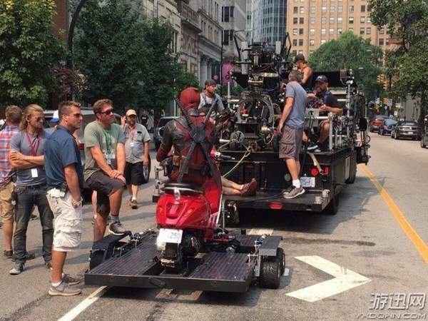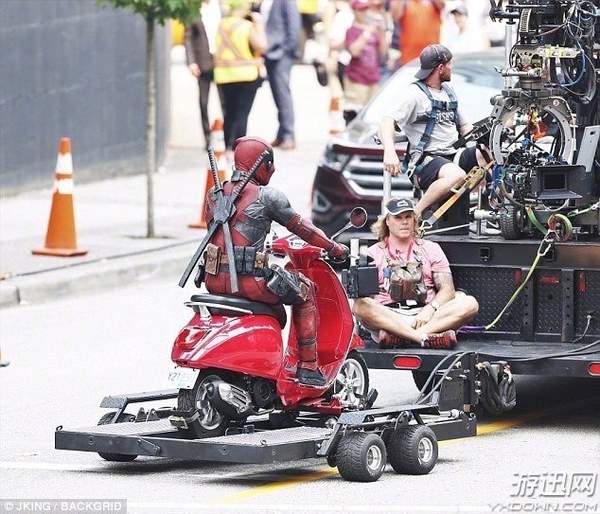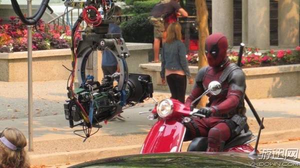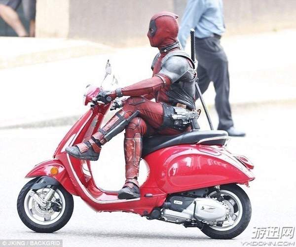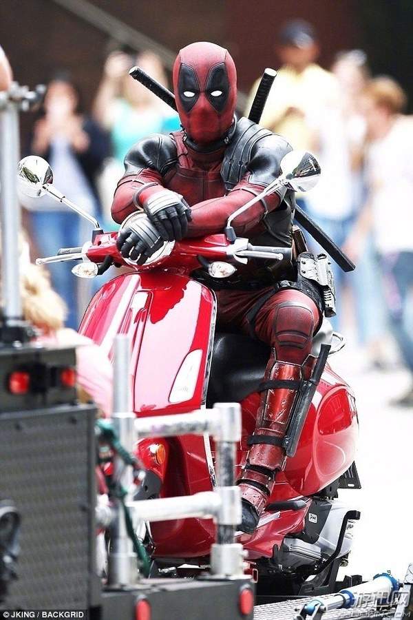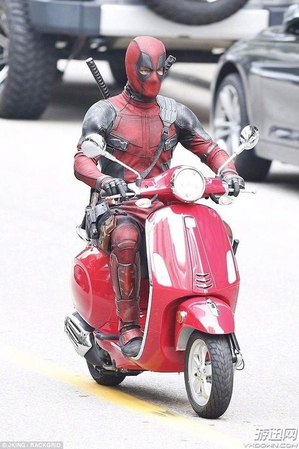 今天《死侍2》电影片方又曝光了小贱贱最新片场照,从照片上我们可以看到死侍翘着二郎腿骑在一辆红色小绵羊上,一会儿对着镜头歪着脖子打招呼,一会儿又变成了严肃脸,画面十分逗趣。