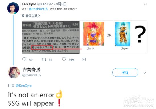 此外,本集编剧吉高寿男前几天还在推特上回应了国外粉丝的疑惑。这位粉丝看到文字介绍里的“超级赛亚人之神”后将其圈红并@了吉高寿男,询问道“这是不是弄错了?”,随后吉高先生回应“并没有弄错,SSG(Super Saiyan God,超级赛亚人之神)将会出场!”,从官方角度作出确认。继两年前的《龙珠:超》第14集后,红发超赛神终于再次出现,届时是否将有更加激烈的战斗?让我们一起期待吧!