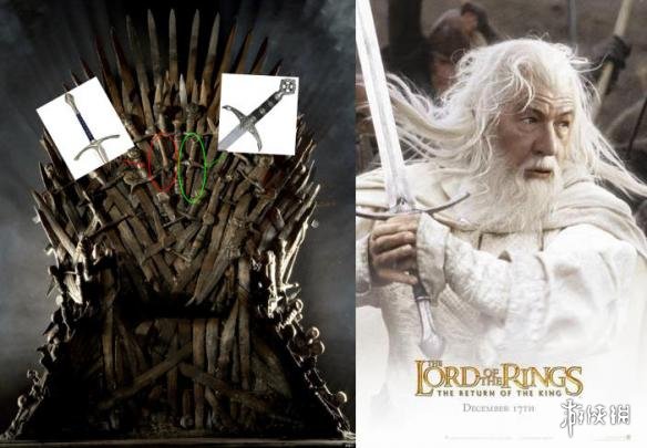 铁王座的椅背部分能找到巫师甘道夫的佩剑格兰姆德灵(Glamdring),可能是博罗米尔(这个角色在《魔戒》里也是“奈德·史塔克”肖恩·宾扮演)从中土世界带来维斯特洛的。甘道夫宝剑的右边那把剑柄属于侠盗王子罗宾汉。