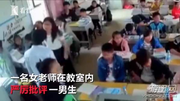 一开始,女老师在教室内严厉批评一男生。