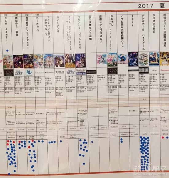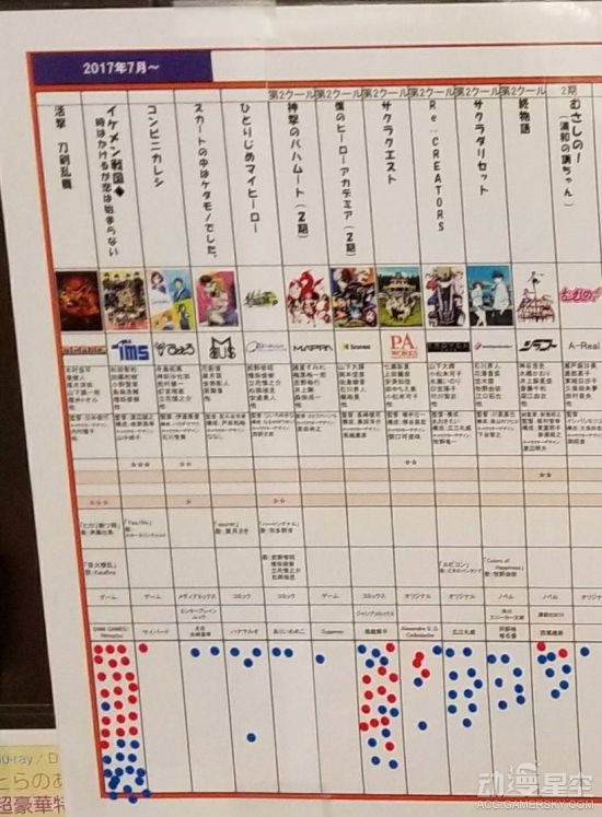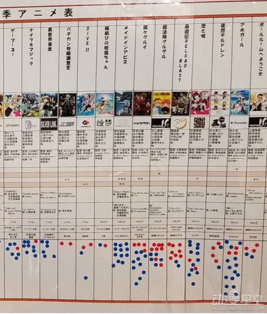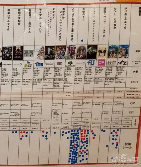 根据现场的照片来看,本次人气投票依然采用了点数制的计算方法,其中红色点数代表女性投票者,蓝色则代表男性,通过圆点的密集程度判断出某部动画的人气程度和性别比例。