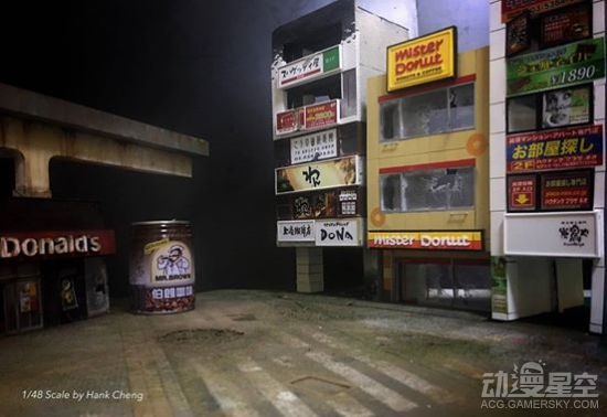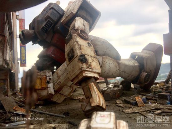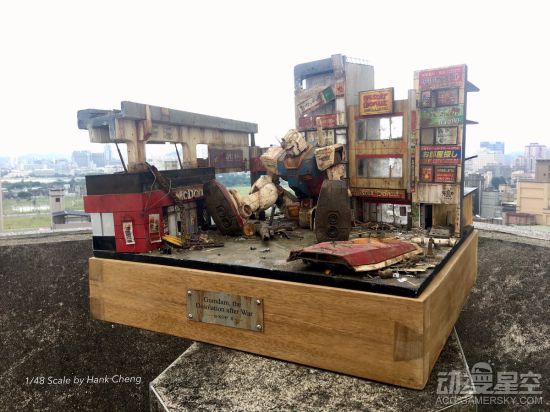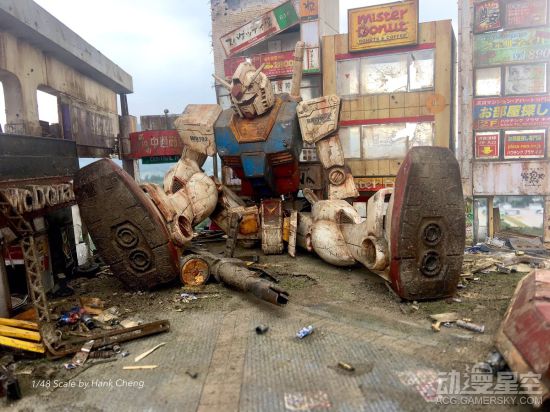 在这个场景中,初代高达RX-78倒在东京街头的废墟上,无论是高达本体还是身后背景都是相当的凄凉。这位推特名为Hank Cheng的模型爱好者也是位大触,这里的高达模型有着浓重的战后沧桑感,和周围的残垣断壁完美的结合到一起,连细节都做的非常精致。