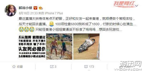 8月16日晚,解说小楼发微博说,“最近直播太拼身体有点不舒服正好和女友一起来香港,就顺便做个常规体检,后天才能回去直播。