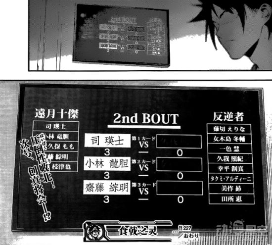 顺着镜头望去,联队食戟第二轮以反叛方的压倒性败北(3:0)宣告结束。在瞬间失去女木岛冬辅和久我照纪两名强力干将之后,接下来反叛方能否顺利翻盘?要知道对面尚有司瑛士和小林龙胆这两位最强的十杰,那么创真的胜算还剩多少呢……