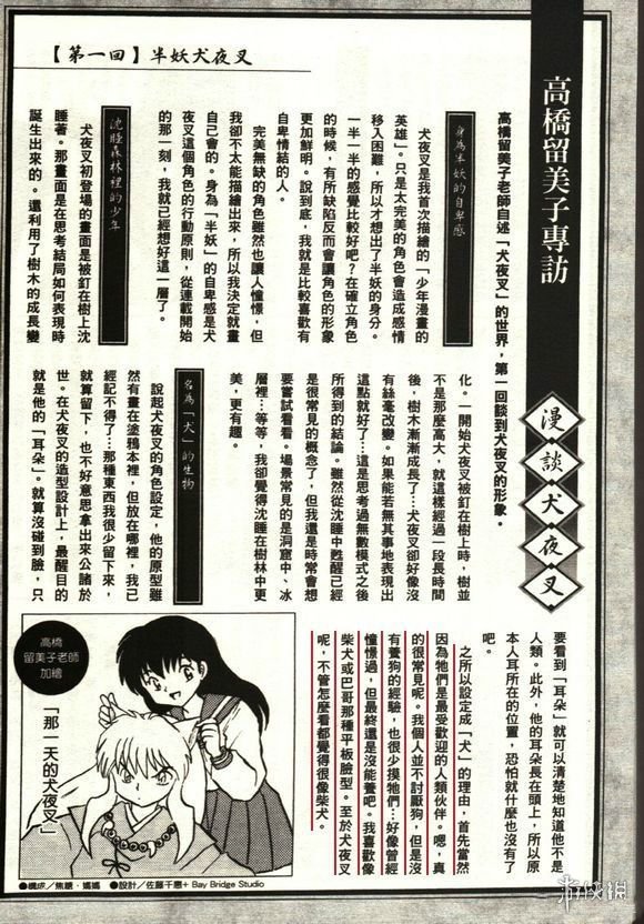 在漫画《犬夜叉豪华版》第一卷卷末访谈中,高桥留美子谈了选择犬妖来作为漫画的主角是因为犬类对人类很忠诚,而对于犬夜叉的感觉则是“不管怎么看都觉得很像柴犬”。看完这段访谈之后,再想想网上的那些柴犬图片,突然有一种莫名的喜感啊,其实很多人都认为犬夜叉是萨摩耶。还有就是如果犬夜叉是柴犬的话,那他们一家应该都是柴犬,想想高冷的杀生丸和犬大将,设定真是一秒崩塌了。