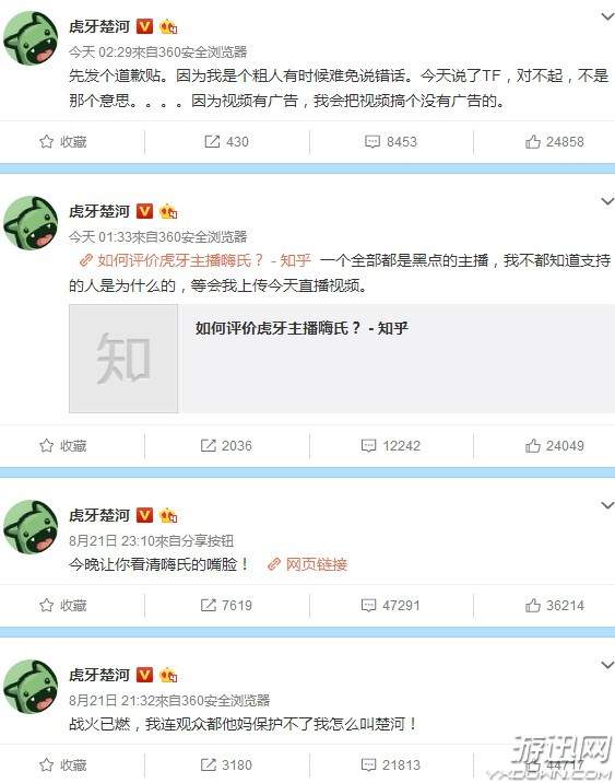 最近直播圈可谓是“风云四起”,虎牙两位主播“主机游戏一哥”楚河与“王者荣耀一哥”嗨氏之间的矛盾闹得沸沸扬扬,据爆料,这次事件的起因是在虎牙的某次活动中,楚河的微博被水军攻陷,而这次的事件涉及嗨氏,对于二人之间的矛盾升级,虎牙方面也发表了声明。