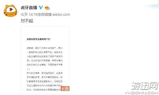 对此虎牙方面发出了声明,直接在微博打出了“对不起”三个字,随后是一篇长文。
