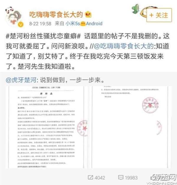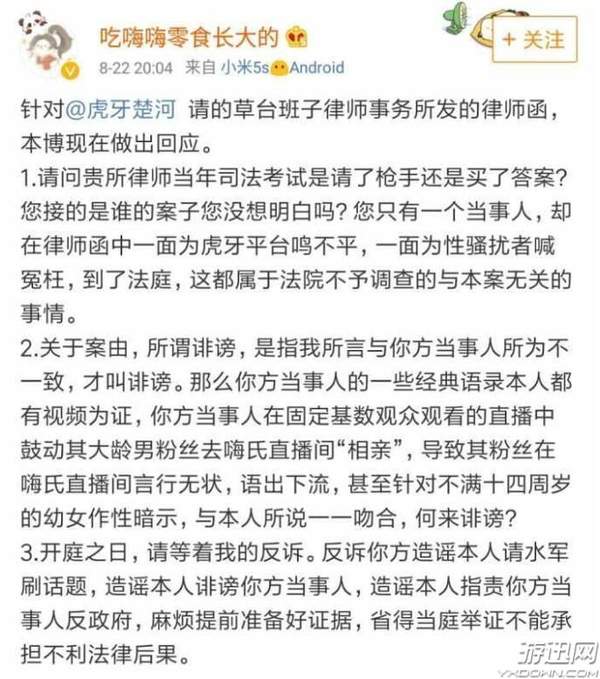 最近最热闹的事情莫过于虎牙主播楚河和嗨氏的撕逼事件了,虽然之前两个人撕的挺严重的。但现在事情看来已经扩大化了,昨天凌晨楚河连发微博,表示人身安全受到威胁要马上搬家,而且已经向嗨氏那边发了律师函。
