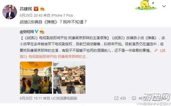 昨晚20:40,担任《战狼》《战狼2》制片的资深电影人,春秋时代(天津)影业有限公司董事长吕建民发微博,声称自己对于《战狼2》改编自小说《弹痕》毫不知情。在转发的一条关于《战狼2》将拍电视剧版微博上评论道:《战狼2》改编自《弹痕》?我咋不知道?