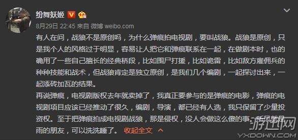 “纷舞妖姬”表示,《战狼2》是完全原创的作品,与自己的小说《弹痕》并不完全一致,是几位编剧共同的创作。可能因为个人风格过于明显,人们才会误解将《战狼2》与《弹痕》联系在一起。说到电视剧版时,他则回应到,自己的小说《弹痕》早已卖出电视剧版权,电视剧《弹痕》并不是剧版的《战狼2》。至于为什么剧版命名为《战狼2》,他则表示,这完全是侵权行为。