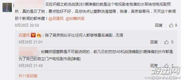 面对网友对他涉嫌炒作的质疑,他回复到:“除了吴京我似乎比任何人都够格署名编剧...无语”。有网友提醒吕建民《弹痕》小说作者是《战狼2》的编剧时,他则回应到:是:之一。似乎对《战狼2》改编自《弹痕》的说法颇为不满。