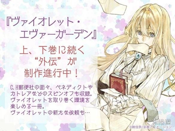 此次官方宣布推出的《紫罗兰永恒花园》的外传小说讲述的是与C.H邮政公司有关的人们,比如CH邮政的邮递员贝内迪克特和CH邮政的自动手记人偶嘉德丽雅的衍生故事,薇尔莉特也将接到新的委托。该外传是否能动画化也非常令人期待。