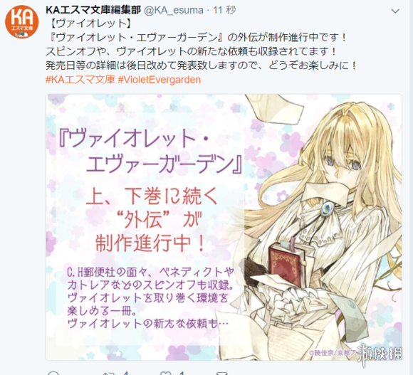 根据晓佳奈创作、高濑亚贵子插画的轻小说作品改编,由京都动画制作的动画《紫罗兰永恒花园》已确定将于2018年1月开播,相信大家都对这部未播就已预定霸权的动画非常期待。而官方对这部作品似乎也是信心十足,正传还没做完,便宣布动画的原作小说外传正在制作中。
