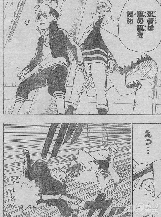 鸣人要和博人对战,佐助也在一边观看,估计他们还是想要研究博人手上那个奇怪的花纹,但是就目前来看并没有什么变化。而且在对战的时候鸣人使用了土遁,感觉这是鸣人第一次使用这个忍术啊。佐助也告诉博人他们“这个世界的危机并没消除”。