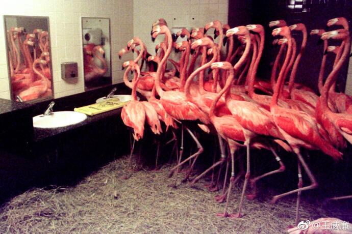 新的飓风就要袭击佛罗里达了,有人翻出了老照片...1998年,为了躲避飓风,50只火烈鸟被迈阿密动物园塞进了男厕所。(王威廉)
