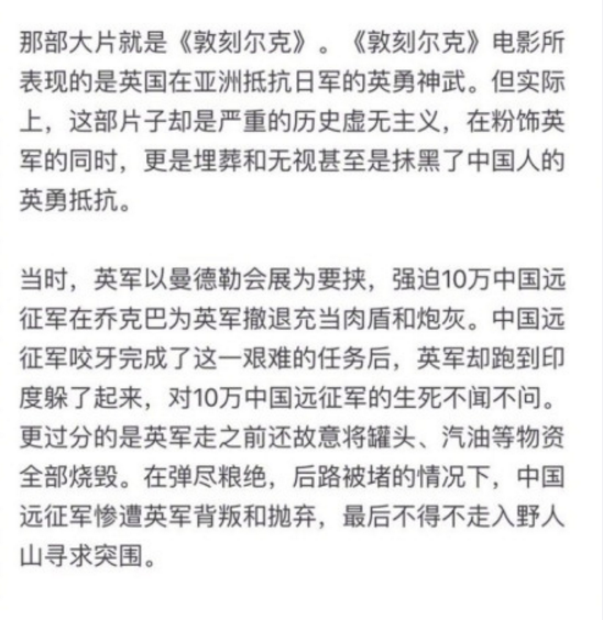 主要是人家王芳女士说了:敦刻尔克大撤退,那奏是英国人炫耀自己在亚洲打日本鬼子的功绩。