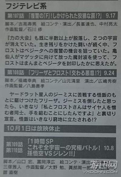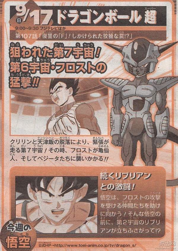 结合报纸和杂志图情报,在预定于9月17日播出的动画第107话里,弗罗斯特将仇恨聚焦在贝吉塔身上,等待着复仇的机会。再加上第六宇宙界王神命令他出击,以此抵消过去的罪责,弗罗斯特立刻便瞄准了龟仙人。正当龟仙人对着马盖塔发出魔封波时,弗罗斯特居然将他的招式转移到贝吉特身上,企图一箭双雕?!就这样,第七宇宙的状况变得越来越严峻起来。