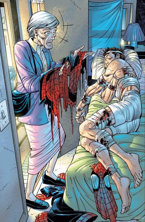 蜘蛛侠在和魔伦大战后,伤痕累累地回到家中,没脱去战服就昏倒在床上。姨妈回到家中发现奄奄一息的他,才恍然大悟。