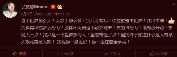 “这个世界那么大!女歌手那么多!别只盯着我!你应该走向世界!踩出中国![good] 我看得出你多么努力!肢体不协调也不放弃跳舞!真的很努力!眼界放开点!格局大一点!我只是一个爱音乐的人!虽然奇怪了点!但我终于知道什么是人善被人欺马善被人欺! 我祝你一路走好!你一定红遍全宇宙! ”