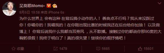 为什么世界上会有这种在背后搞小动作的人!善良点不行吗?我从来没踩过你!你唱你的!我唱我的!在你刚出现比赛的时候我还在后台给你加油!以及微博上!你背后说我什么我都当耳旁风,从不散播。接触过你的都说你那90度的大鞠躬很假!我终于明白了!真的很失望!继续你的假抒情吧!