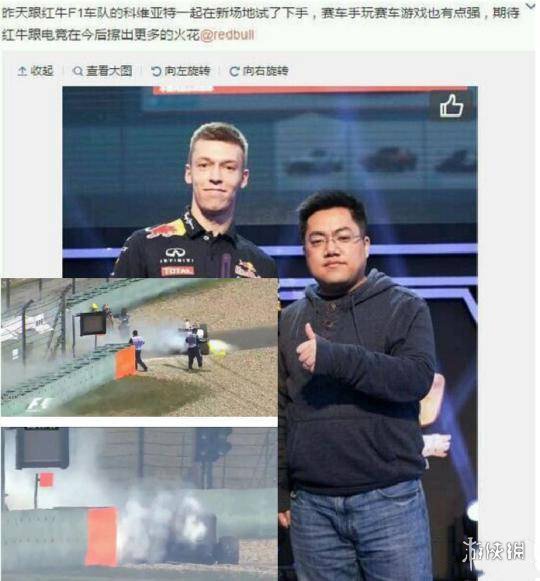某次旭东老师在微博放出与红牛车队车手科维亚特的合照。并配文说:“昨天跟红牛F1车队的科维亚特一起在新场地试了下手,赛车手玩赛车游戏也有点强,期待红牛跟电竞在今后擦出更多的火花。”
